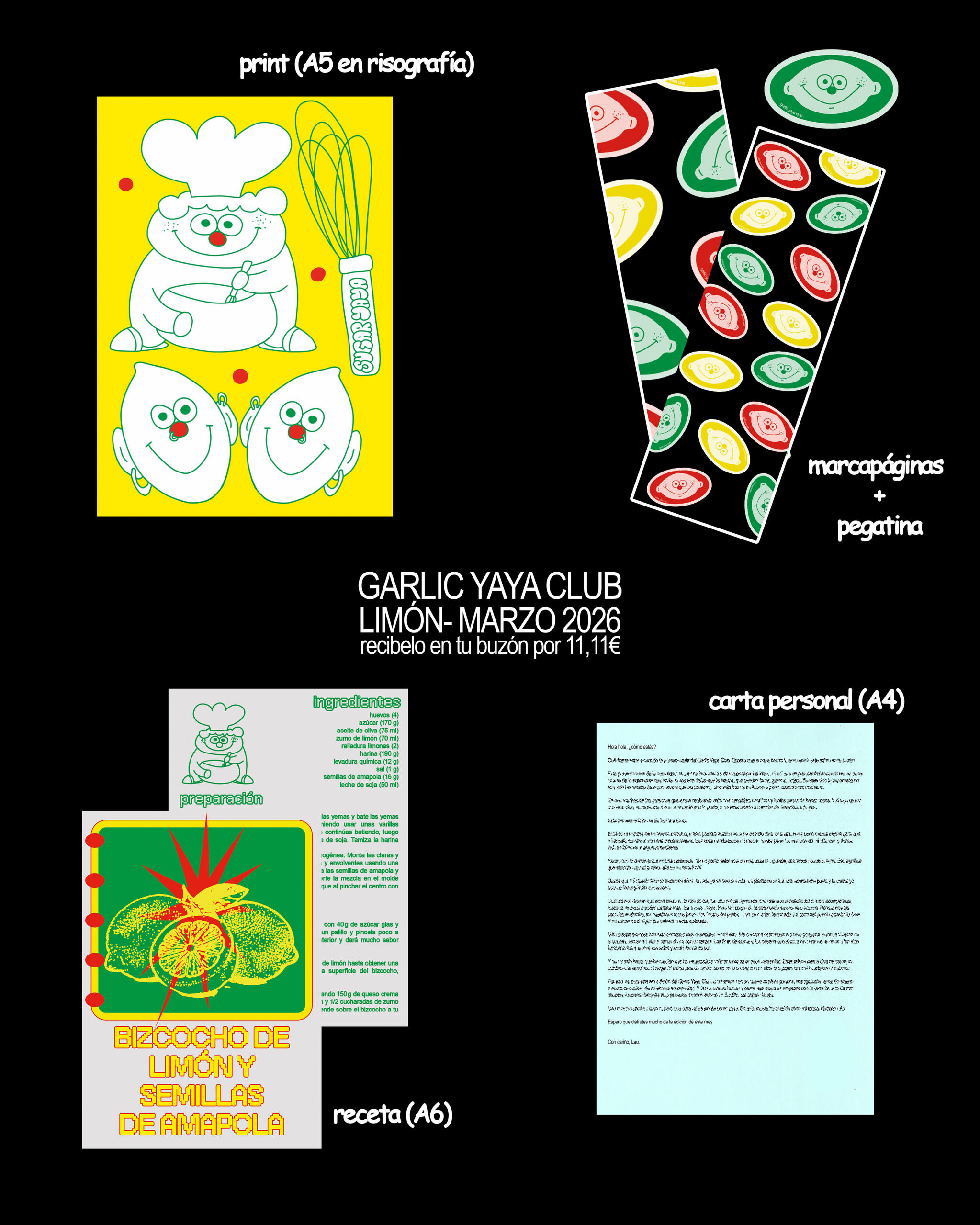En la edición de este mes vuelve nuestra querida Sugar Yaya para deleitarnos con una receta dulce.Después de unos cuantos bizcochos de limón a mis espaldas en los últimos meses, creo que por fin he dado con la receta perfecta, y esa es justo la que vengo a compartir con vosotrxs. Es una receta muy fácil y muy resultona, con algunos pequeños extras para que podáis adaptarla o darle vuestro propio toque cuando os apetezca.Esta edición también es especial porque, por primera vez, incluye un print impreso en risografía. Es una técnica que tenía muchísimas ganas de probar desde hace tiempo y que creo que ha venido para quedarse.Como siempre, también encontraréis la receta en formato A6, perfecta para colgar en la nevera con una pincita y tener siempre a mano vuestro bizcocho de limón con semillas de amapola.Y además, esta edición incluye un par de extras, un marcapáginas y una pequeña pegatina inspirada en las míticas pegatinas que vienen en la fruta pero a mi estilo!